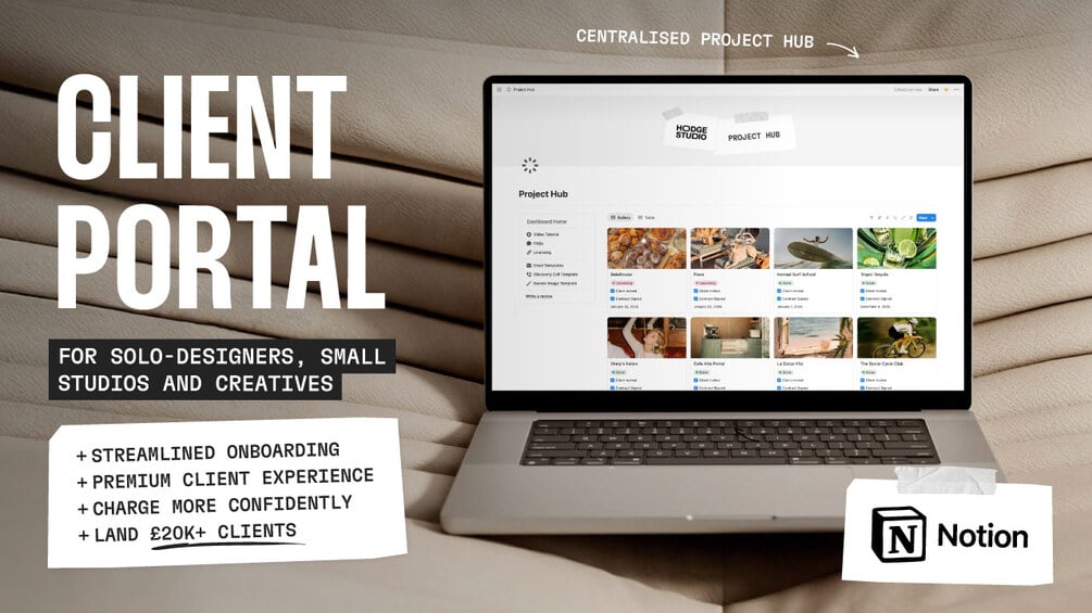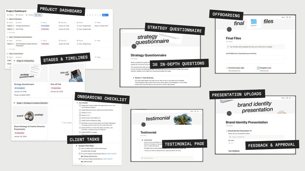 A ready-to-use Notion Client Portal system for managing all your branding and design client projects in one place. It’s the exact workflow I use for my high-ticket projects (£20k+), and includes my Strategy Questionnaire that has already sold 305+ times on its own.